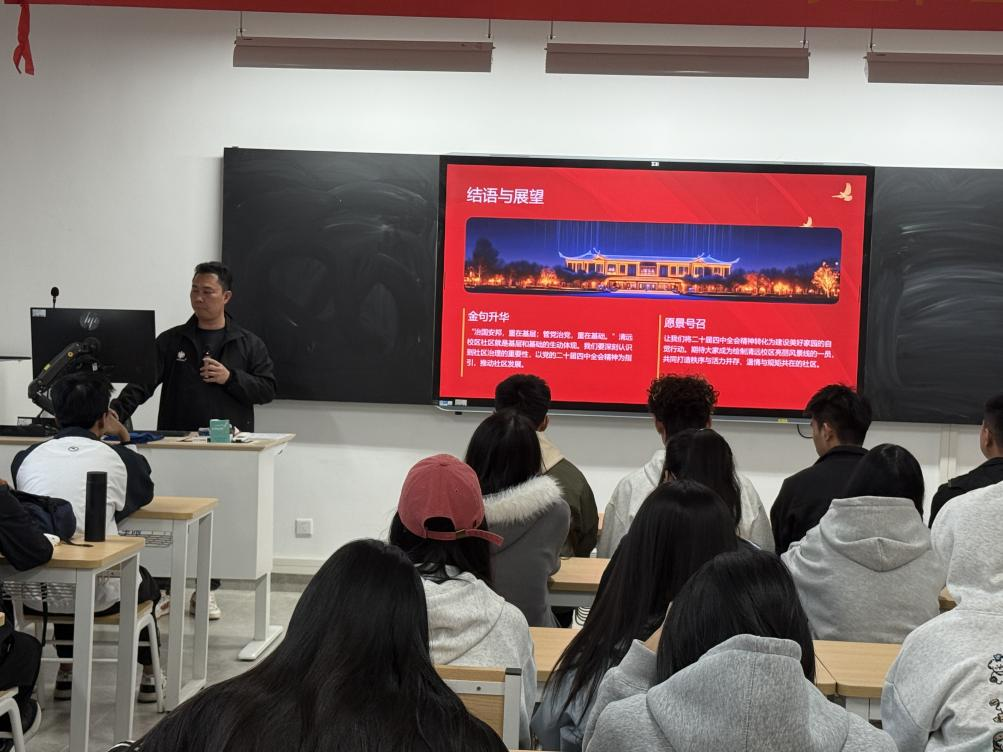活动突破传统模式,采用“理论+实践”双轮驱动。在党课环节,易木寿副书记以贴近现实的语言,将国家制度优势巧妙映射至社区场景——“党的集中统一领导”体现为社区党支部的战斗堡垒作用;“人民当家作主”融入学生议事会与楼长制度;“全面依法治国”与校园规章紧密结合。课程深入浅出,引导学生认识到:社区,正是感知“中国之治”的微观窗口。