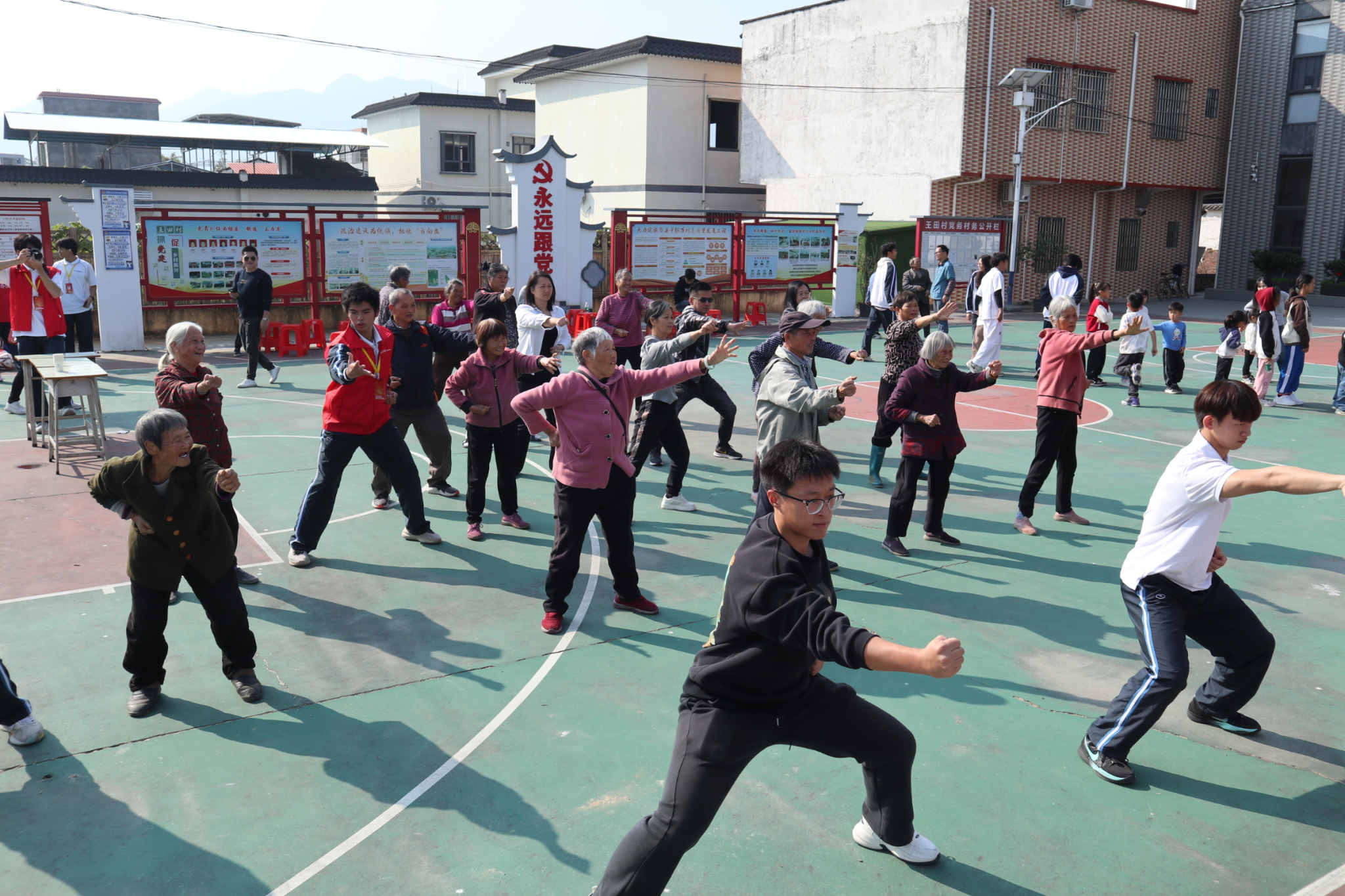 活动于清晨开始,学院学生志愿者团队为现场村民带来了篮球、足球、健美操、八段锦、跆拳道等多项体育项目展演。展演结束后,志愿者组织村民进行了趣味游戏互动,并引导村民亲身体验各项运动。现场气氛热烈,村民参与踊跃。
