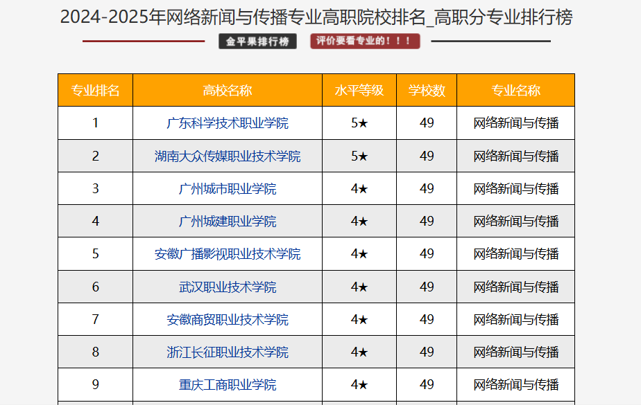 根据金苹果高职专科专业排名榜(2024)显示:广州城建职业学院网络新闻与传播专业在全国开设同专业的院校中排全国第4名、广东省第3名。学院还是全国职业教育新媒体专业联盟常务理事单位。
