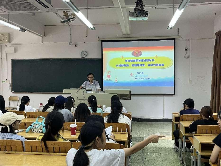 活动在林培淼副教授题为《学前教育即将走进新时代:认清新形势,规划好时光,以实力赢未来》的专题讲座中拉开帷幕。他以自身丰富的幼儿园工作经验出发,立足新时代学前教育发展大势,深入浅出地剖析了行业发展趋势与人才需求变化,通过真实案例与数据对比,帮助新生建立清晰的职业认知。他特别强调:“在这个充满机遇与挑战的时代,唯有扎实的专业根基、持续的学习能力和深厚的教育情怀,才能在幼教领域赢得未来。”讲座现场掌声不断,新生们纷纷表示对专业前景有了更深刻的理解,对职业生涯规划有了更明确的方向。