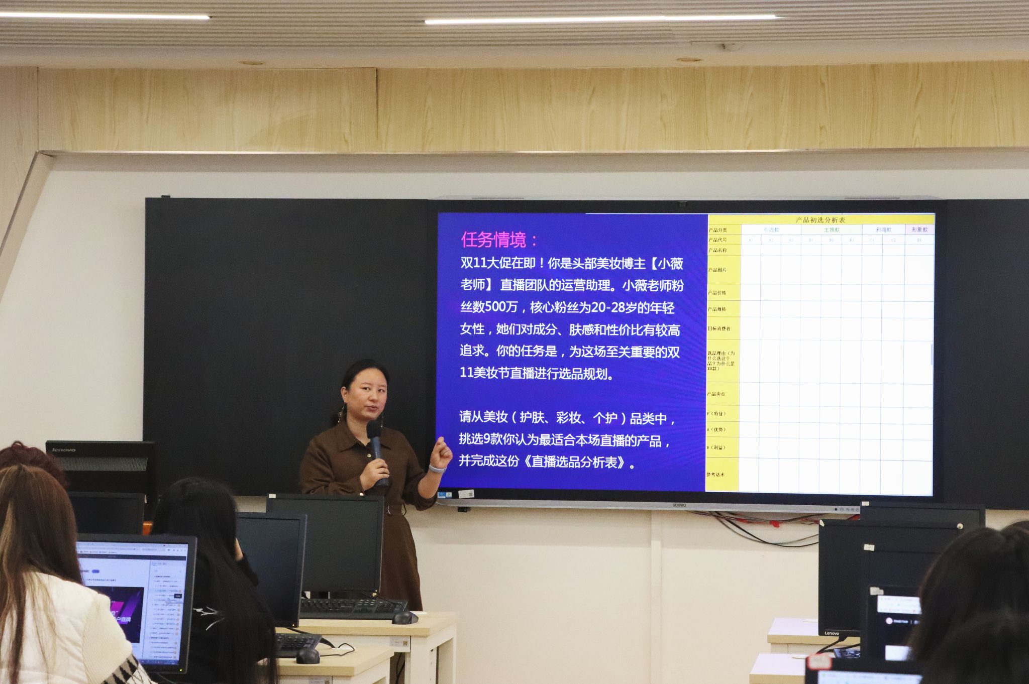 据悉,微专业以“直播电商全流程运营”与“AI工具创新应用”为核心内容,涵盖直播选品、文案、短视频创作、直播策划、数据分析、智能内容生成等前沿内容。课程采用“线上+线下”融合教学模式,其中线上课程依托学院数字化学习平台,提供线上微课、案例库、在线答疑、课后练习等资源,方便学生利用碎片化时间巩固知识;线下课程则以实训教室为阵地,通过模拟直播间搭建、设备操作演练、小组协作完成直播任务等形式,让学生沉浸式体验直播全流程。这种“实践与理论并行”的教学方式,有效打破了传统课堂填鸭式教学的局限,帮助学生快速适应行业实操需求。