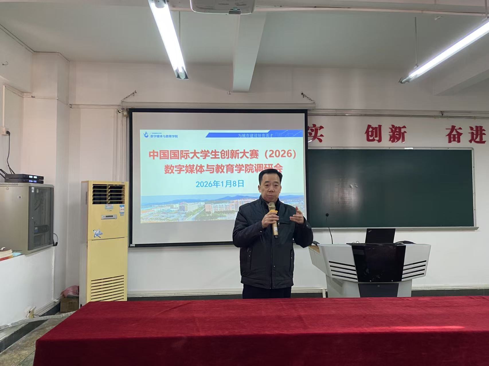 为积极备战2026年中国国际大学生创新大赛,1月8日上午,学院在人文艺术楼513会议室举行专题调研会。学校校长助理兼创业教育学院院长邱漠河,创教学院办公室主任周峰,专任教师侯树钰、文戈莅临指导,学院院长鲁岩,副院长朱丽芳、龙轩以及项目团队师生成员共60余人参与会议。